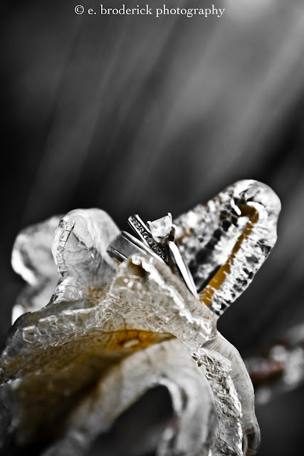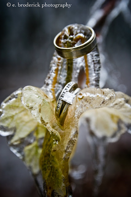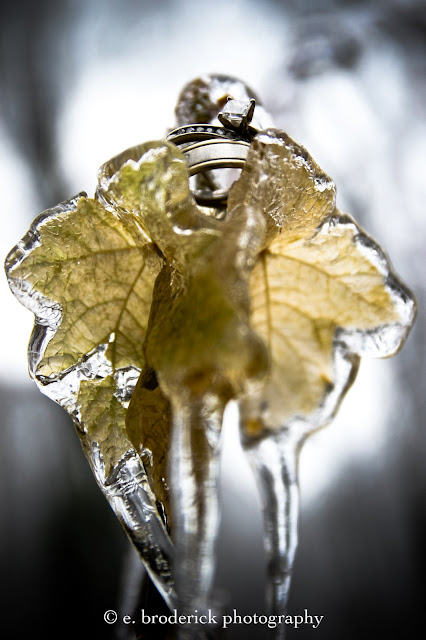 I had been meaning to try out the macro setting on one of my more neglected lenses and this just seemed like a perfect opportunity. I grabbed Tim’s ring and my own and set them gingerly on this ice covered leaf.
