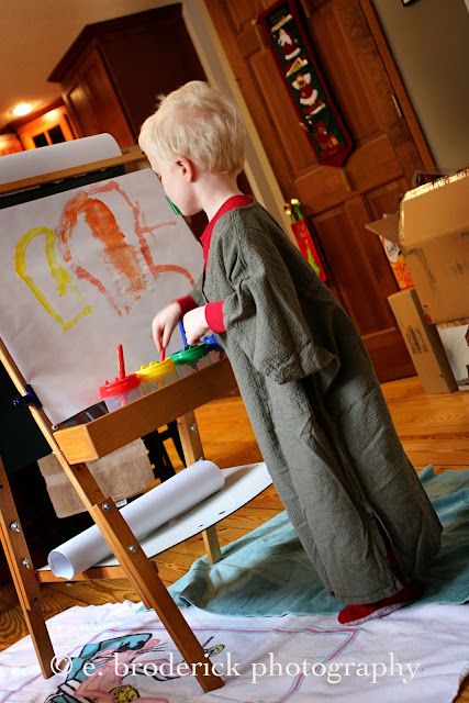 Finn is painting pictures for his cousins with his new paints: